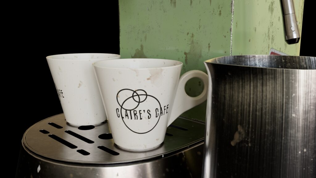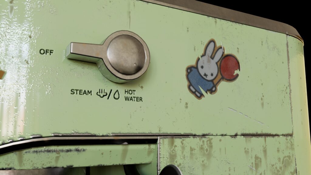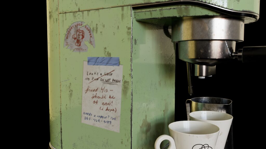I wanted to give the espresso machine a well-used feel by adding grunge, old stickers, and notes to the machine.